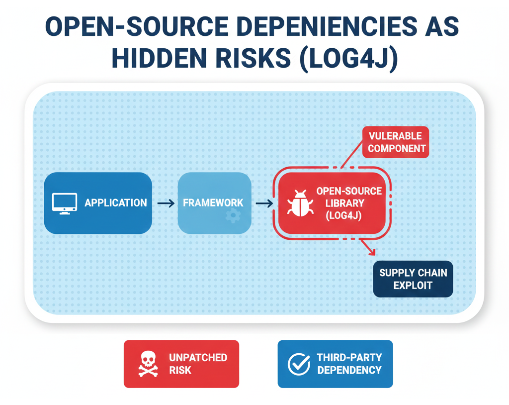 The Log4j vulnerability demonstrated the systemic risks hidden within open-source software. Log4j was deeply embedded across millions of applications, often without developers’ explicit knowledge. When the vulnerability was disclosed, organizations struggled to identify where it existed within their environments.